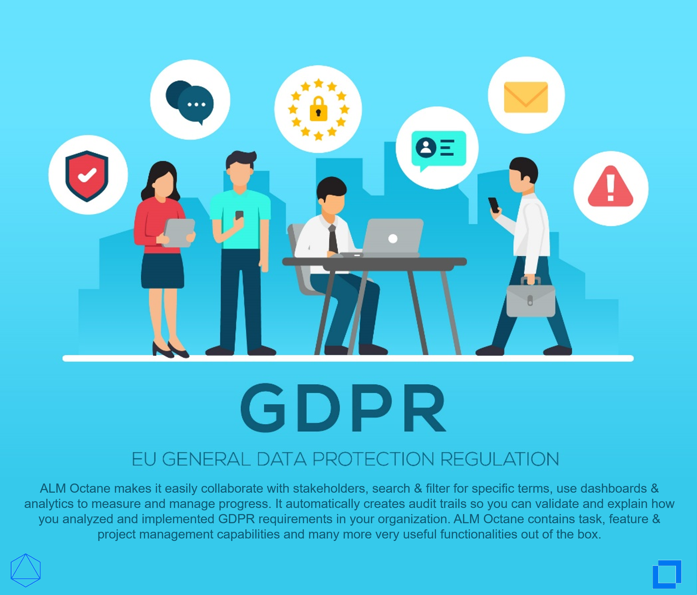 ALM Octane makes it much easier to work with the GDPR: You can easily collaborate with stakeholders, search & filter for specific terms, use dashboards & analytics to measure and manage progress. It automatically creates audit trails so you can validate and explain how you analyzed and implemented GDPR requirements in your organization. ALM Octane contains task, feature & project management capabilities and many more very useful functionalities out of the box.