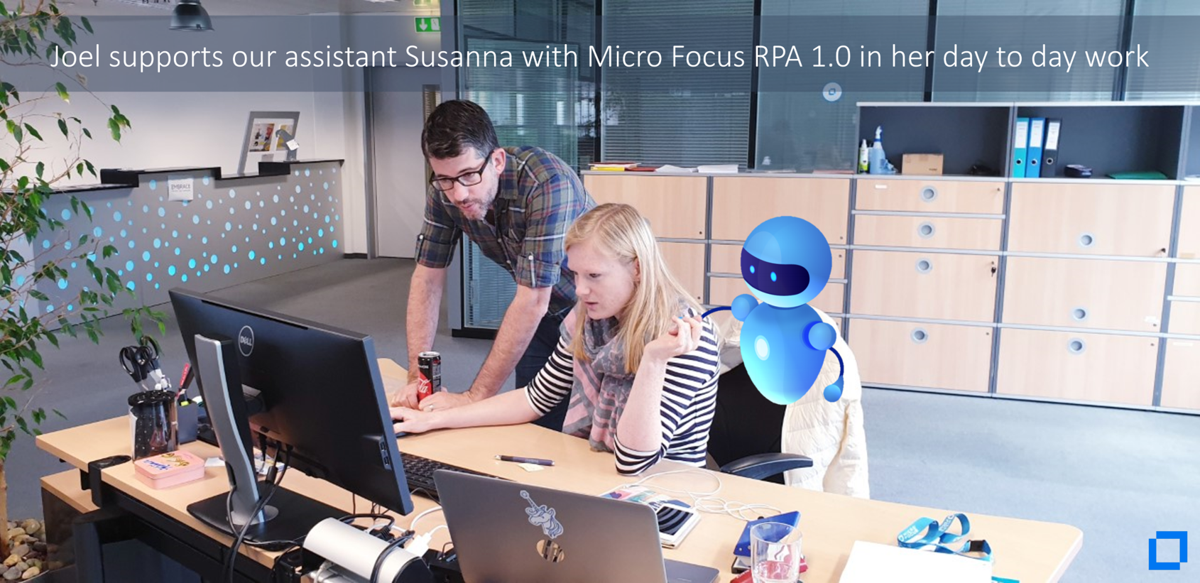 Joel Flueckiger and Susanna Bär work together at #Micro #Focus on #E2E #Order to #Cash (O2C) processes for our location in Switzlerland. Susanna Bär spends too much time on #mundane, #repetitive, error-prone tasks with #SAP, #Fiori, #Mails, #PDF and #Excel.