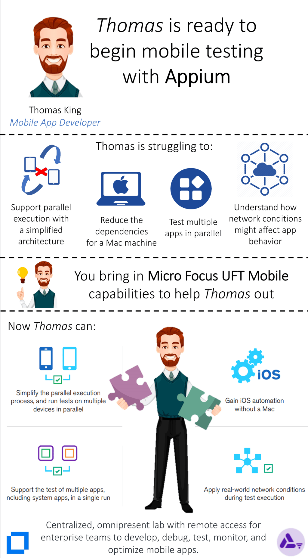 Micro Focus UFT Mobile provides an end-to-end quality lab of real devices and emulators that help you test, monitor, and optimize your mobile apps for an enhanced user experience.